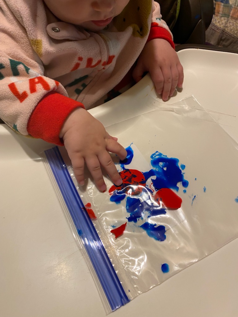 Because my youngest is too little to keep things out of her mouth, I filled a Ziploc bag with a couple dabs of red and blue so she could safely enjoy mixing colors.