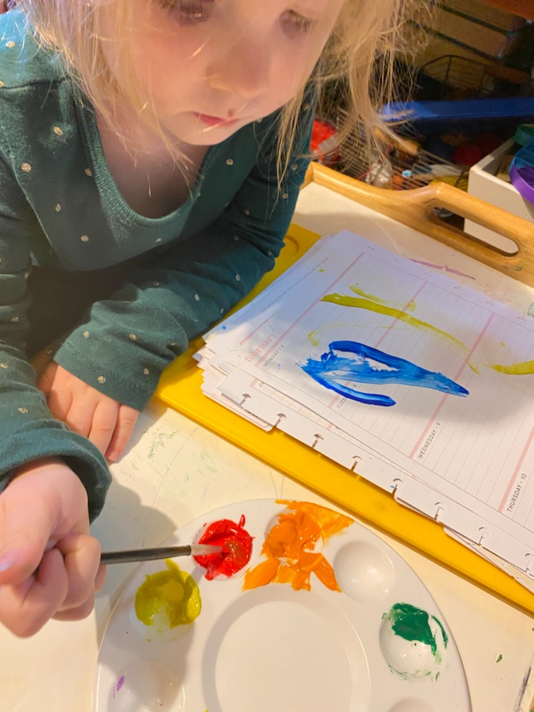 As they explored color in their own paintings, I read Cowboy Charlie aloud again, asking Millie about her favorite parts and animals. She decided to paint a sheep, just like Charlie.