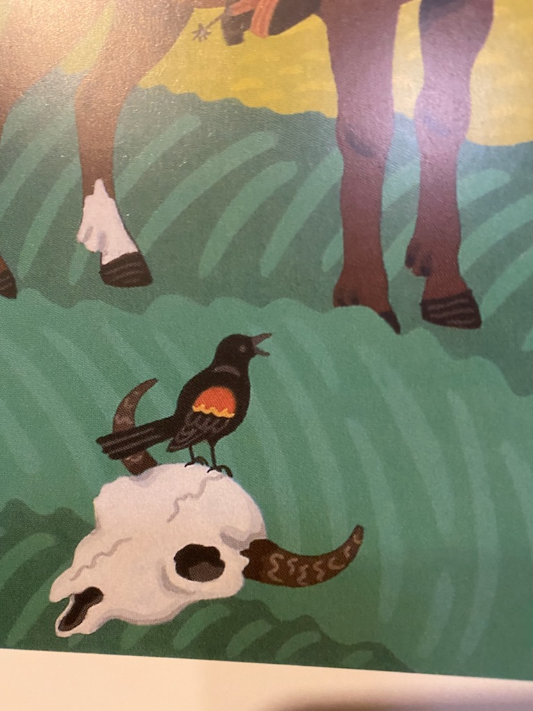 Winter not only wrote the story, but illustrated each page in gorgeous acrylics. I loved showing the pictures to my preschooler, who in turn enjoyed showing me various details. Her very favorite was this depiction of “a bird sitting on a dragon skull”.