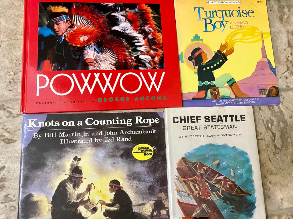 It has been really enjoyable to share these stories with my children, especially since my aunt has been exposing us to Native American culture since we were little. I also enjoy the balance of learning about pioneers and cowboys while also learning about the people who already lived in these ‘unsettled’ places.